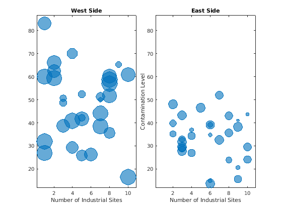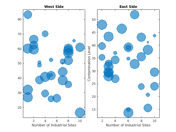 tiledlayout(1,2,'TileSpacing','compact') % West side ax1 = nexttile; bubblechart(ax1,nsites1,levels1,towns1); title('West Side') xlabel('Number of Industrial Sites') % East side ax2 = nexttile; bubblechart(ax2,nsites2,levels2,towns2); title('East Side') xlabel('Number of Industrial Sites') ylabel('Contamination Level')