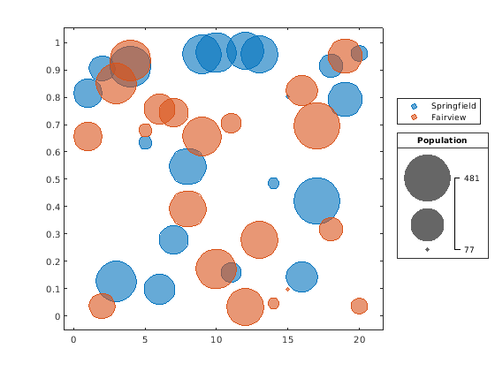 blgd = bubblelegend('Population'); lgd = legend('Springfield','Fairview'); blgd.Layout.Tile = 'east'; lgd.Layout.Tile = 'east';