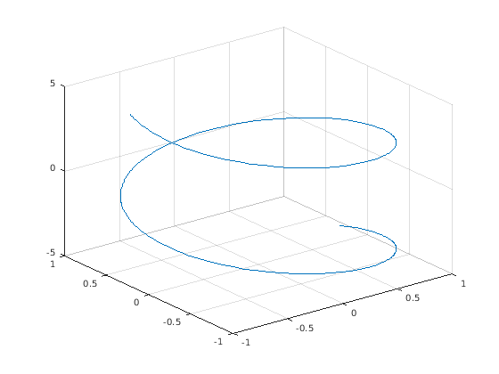 fplot3(funx,funy,funz) строит параметрическую кривую, заданную x = funx(t), y = funy(t), и z = funz(t) на интервале по умолчанию [-5,5] для t.