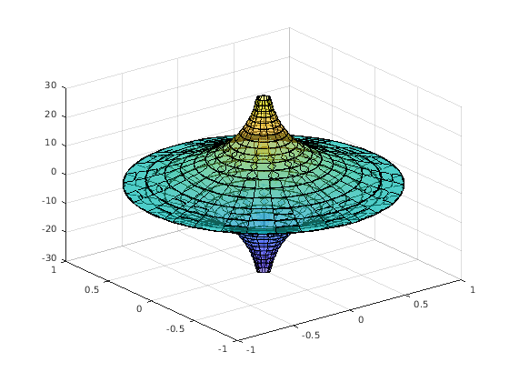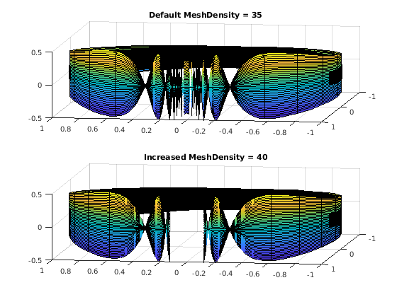 tiledlayout(2,1) nexttile fsurf(@(s,t) sin(s), @(s,t) cos(s), @(s,t) t/10.*sin(1./s)) view(-172,25) title('Default MeshDensity = 35') nexttile fsurf(@(s,t) sin(s), @(s,t) cos(s),... @(s,t) t/10.*sin(1./s),'MeshDensity',40) view(-172,25) title('Increased MeshDensity = 40')