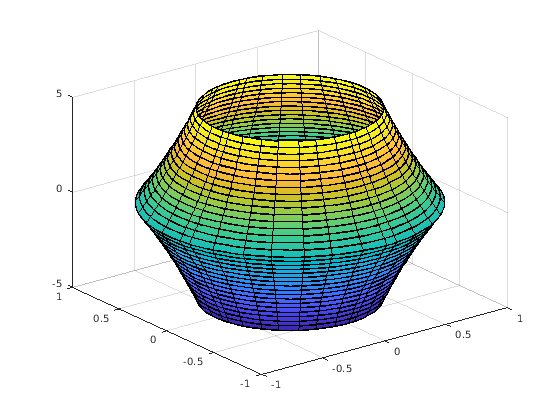 x = @(u,v) exp(-abs(u)/10).*sin(5*abs(v)); y = @(u,v) exp(-abs(u)/10).*cos(5*abs(v)); z = @(u,v) u; fs = fsurf(x,y,z)
