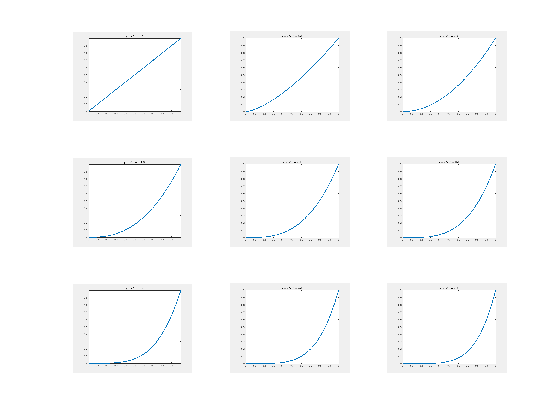 n = 1:0.5:5; nImages = length(n); fig = figure; for idx = 1:nImages y = x.^n(idx); plot(x,y,'LineWidth',3) title(['y = x^n, n = ' num2str( n(idx)) ]) drawnow frame = getframe(fig); im{idx} = frame2im(frame); end close;