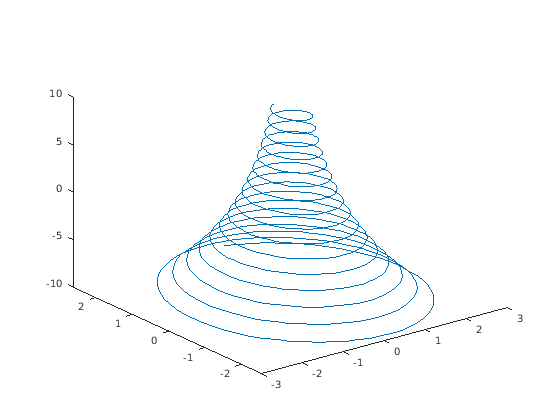 t = linspace(-10,10,1000); xt = exp(-t./10).*sin(5*t); yt = exp(-t./10).*cos(5*t); p = plot3(xt,yt,t);