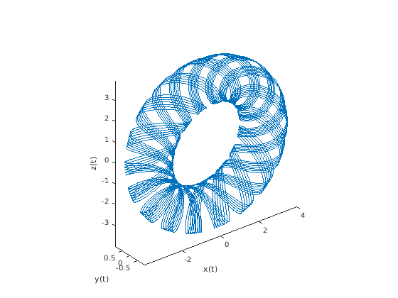 t = 0:pi/500:40*pi; xt = (3 + cos(sqrt(32)*t)).*cos(t); yt = sin(sqrt(32) * t); zt = (3 + cos(sqrt(32)*t)).*sin(t);