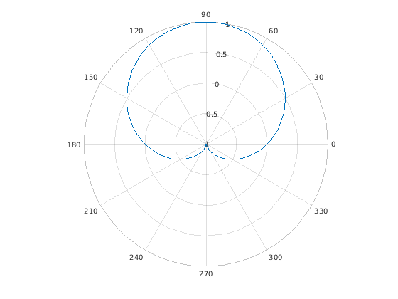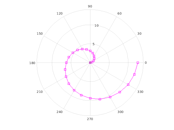 polarplot(theta,rho) строит график в полярных координатах, с theta указание на угол в радианах и rho указание на значение радиуса для каждой точки. Входные параметры должны быть векторами с равной длиной или матрицами с равным размером. Если входные параметры являются матрицами, то polarplot столбцы графиков rho по сравнению со столбцами theta. В качестве альтернативы одни из входных параметров могут быть вектором и другим матрица, пока вектор является той же длиной как одна размерность матрицы.