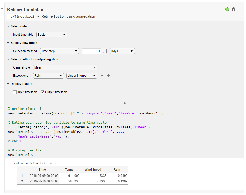 Повторно синхронизировать задача Расписания позволяет вам в интерактивном режиме изменить времена строки расписания и затем передискретизировать или агрегировать данные в его переменных. Задача автоматически генерирует MATLAB® код для вашего live скрипта.