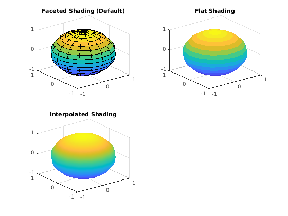 shading(gca,'interp')shading устанавливает EdgeColor и FaceColor свойства всей поверхности и графических объектов закрашенной фигуры в текущей системе координат. shading устанавливает соответствующие значения, в зависимости от того, представляют ли поверхность или объекты закрашенной фигуры сетки или твердые поверхности.