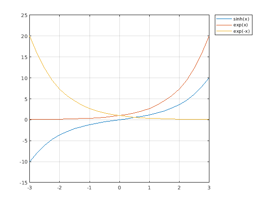x = -3:0.25:3; y1 = sinh(x); y2 = exp(x); y3 = exp(-x); plot(x,y1,x,y2,x,y3) grid on legend('sinh(x)','exp(x)','exp(-x)','Location','bestoutside')