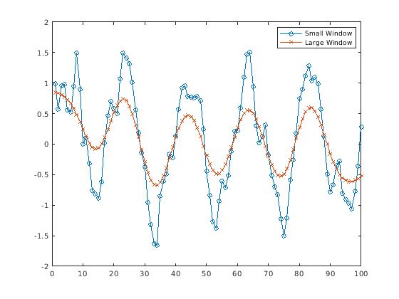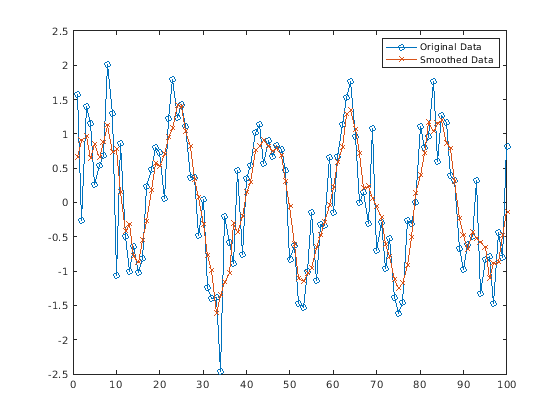 Когда размер окна для метода сглаживания не задан, smoothdata вычисляет размер окна по умолчанию на основе эвристики. Для коэффициента сглаживания τ, эвристика оценивает размер окна скользящего среднего значения, который затухает приблизительно 100*τ процент энергии входных данных.