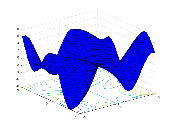 [X,Y] = meshgrid(-5:.5:5); Z = Y.*sin(X) - X.*cos(Y); sc = surfc(X,Y,Z,'FaceColor','b');