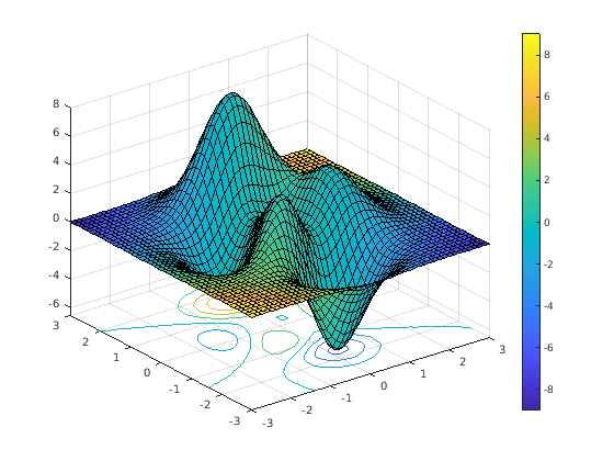 [X,Y] = meshgrid(-3:.125:3); Z = peaks(X,Y); C = X.*Y; surfc(X,Y,Z,C) colorbar
