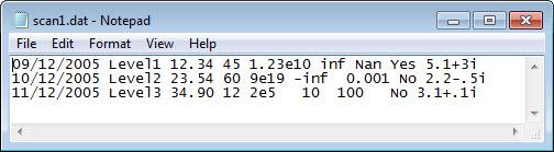 filename = 'scan1.dat';Откройте файл и считайте каждый столбец с соответствующим спецификатором преобразования. textscan возвращает 1-by-9 массив ячеек C.