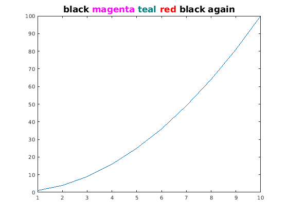 plot((1:10).^2) title(['\fontsize{16}black {\color{magenta}magenta '... '\color[rgb]{0 .5 .5}teal \color{red}red} black again'])