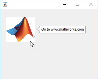function imagetoURL fig = uifigure('Visible','off'); fig.Position(3:4) = [333 239]; im = uiimage(fig); im.Position = [20 120 100 100]; im.ImageSource = 'membrane.png'; im.ImageClickedFcn = @ImageClicked; im.Tooltip = 'Go to www.mathworks.com'; function ImageClicked(src,event) url = 'https://www.mathworks.com/'; web(url); end fig.Visible = 'on'; end