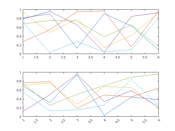 возвращает угол поворота для меток в виде галочки оси X текущей системы координат как скалярное значение в градусах. Положительные значения указывают против часовой стрелки на вращение. Отрицательные величины указывают по часовой стрелке на вращение.ang = xtickangle