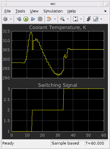 Блок Multiple MPC Controllers позволяет вам достигнуть лучшего управления, когда условия работы изменяются. Используя доступные измерения, можно обнаружить текущую операционную область во время выполнения и выбрать соответствующий активный контроллер через switch входной порт. Переключение контроллеров для различных операционных областей является общим подходом к решению нелинейных проблем управления с помощью линейных методов управления.