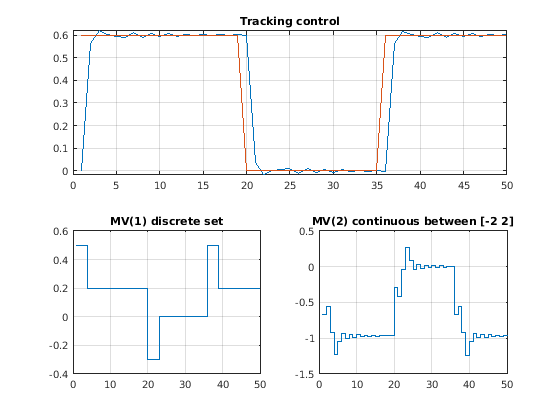 figure(2) subplot(211) % plant output plot([YY,r]); grid title("Tracking control"); subplot(223) % first plant input stairs(UU(:,1)); grid title("MV(1) discrete set") subplot(224) % second plant input stairs(UU(:,2)); grid title("MV(2) continuous between [-2 2]")