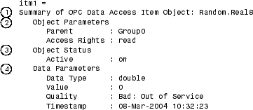 itm = OPC Item Object Array: Index: DataType: Active: ItemID: 1 double on item.id.1 2 uint16 on item.id.2 3 double on item.id.3