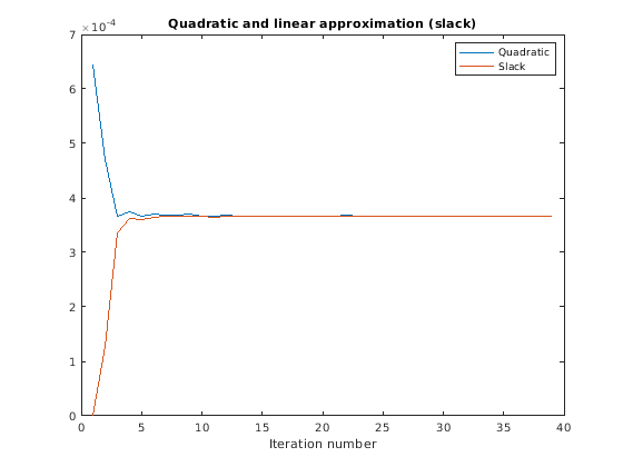 plot(history) legend('Quadratic','Slack') xlabel('Iteration number') title('Quadratic and linear approximation (slack)')