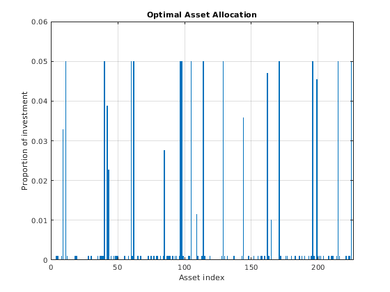 bar(xLinInt(xvars)) grid on xlabel('Asset index') ylabel('Proportion of investment') title('Optimal Asset Allocation')
