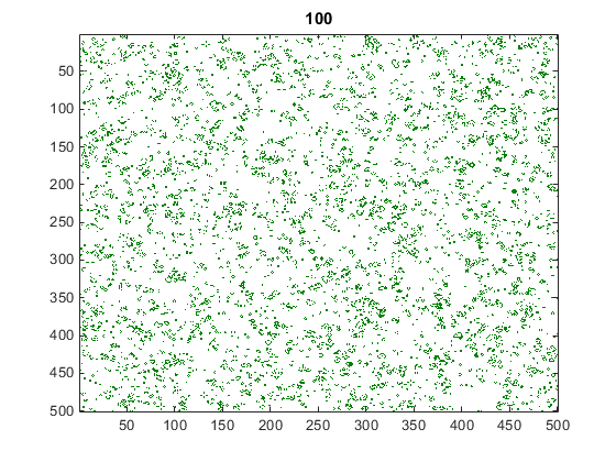 gridSize = 500; numGenerations = 100; initialGrid = (rand(gridSize,gridSize) > .75); gpu = gpuDevice(); % Draw the initial grid hold off imagesc(initialGrid); colormap([1 1 1;0 0.5 0]); title('Initial Grid');