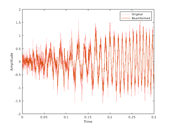 Вызовите step выполнять beamforming операцию согласно свойствам phased.TimeDelayLCMVBeamformer. Поведение step характерно для каждого объекта в тулбоксе.