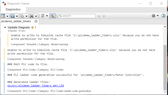 На, завершение генерации кода окно Diagnostic отображает сообщение с путем к сгенерированному файлу L5X.