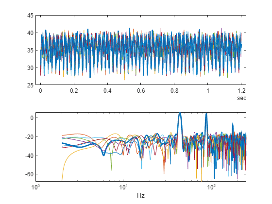 %Figure with nominal and faults figure, subplot(211); lFlow = plot(flow.Time,flow.Data,'LineWidth',2); subplot(212); lFlowP = semilogx(flowF,pow2db(flowP),'LineWidth',2); xlabel('Hz') ct = 1; lColors = get(lFlow.Parent,'ColorOrder'); lIdx = 2; % Loop over all members in the ensemble, preprocess % and compute the features for each member while hasdata(ens) % Read member data data = read(ens); % Preprocess and extract features from the member data [flow,flowP,flowF,faultValues] = preprocess(data); feat = extractCI(flow,flowP,flowF); % Add the extracted feature values to the member data dataToWrite = [faultValues, feat]; writeToLastMemberRead(ens,dataToWrite{:}) % Plot member signal and spectrum for every 100th member if mod(ct,100) == 0 line('Parent',lFlow.Parent,'XData',flow.Time,'YData',flow.Data, ... 'Color', lColors(lIdx,:)); line('Parent',lFlowP.Parent,'XData',flowF,'YData',pow2db(flowP), ... 'Color', lColors(lIdx,:)); if lIdx == size(lColors,1) lIdx = 1; else lIdx = lIdx+1; end end ct = ct + 1; end