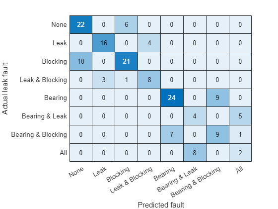 % Check performance by computing and plotting the confusion matrix actualValue = response(cvp.test(1),:); predictedValue = predict(combinedClassifier, predictors(cvp.test(1),:)); confdata = confusionmat(actualValue,predictedValue); figure, labels = {'None', 'Leak','Blocking', 'Leak & Blocking', 'Bearing', ... 'Bearing & Leak', 'Bearing & Blocking', 'All'}; h = heatmap(confdata, ... 'YLabel', 'Actual leak fault', ... 'YDisplayLabels', labels, ... 'XLabel', 'Predicted fault', ... 'XDisplayLabels', labels, ... 'ColorbarVisible','off');