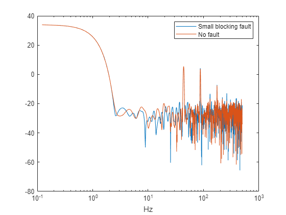 % Look for the member that was incorrectly predicted, and % compute its power spectrum idx = ... data.BlockingFault == fData.BlockingFault(1) & ... data.LeakFault == fData.LeakFault(1) & ... data.BearingFault == fData.BearingFault(1); flow1 = data(idx,1); flow1 = flow1.qOut_meas{1}; [flow1P,flow1F] = pspectrum(flow1); % Look for a member that does not have any faults idx = ... data.BlockingFault == 0.8 & ... data.LeakFault == 1e-9 & ... data.BearingFault == 0; flow2 = data(idx,1); flow2 = flow2.qOut_meas{1}; [flow2P,flow2F] = pspectrum(flow2); % Plot the power spectra semilogx(... flow1F,pow2db(flow1P),... flow2F,pow2db(flow2P)); xlabel('Hz') legend('Small blocking fault','No fault')