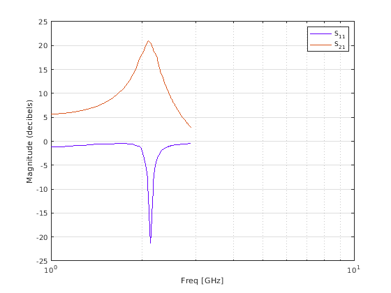 Используйте MATLAB semilogx функция, чтобы создать график полулогарифмической шкалы сетевых параметров, которые заданы как векторные данные и не являются частью схемы (rfckt) объект или данные (rfdataобъект.