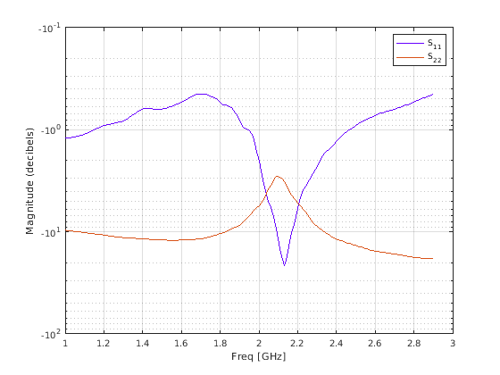 semilogy( строит параметр схемы h,circuitPara)circuitPara от RFCKT или объекта данных RF h использование логарифмического масштаба для y - ось. Можно задать несколько параметров схемы в этом синтаксисе.