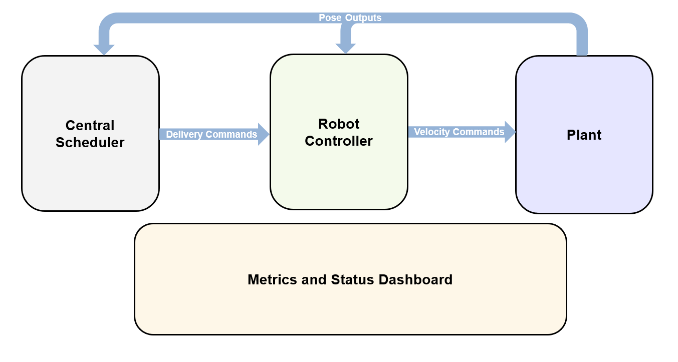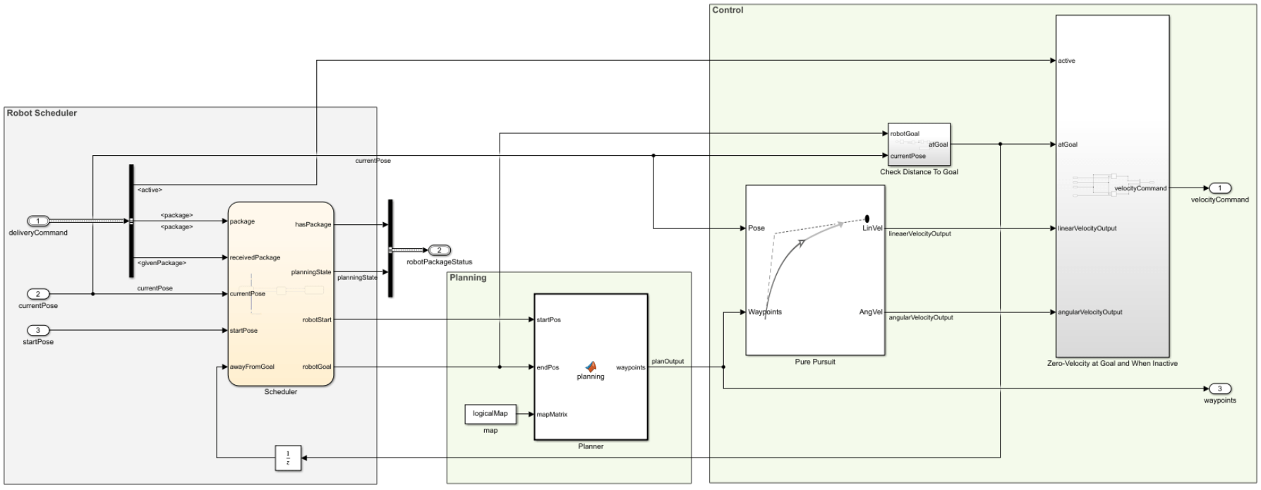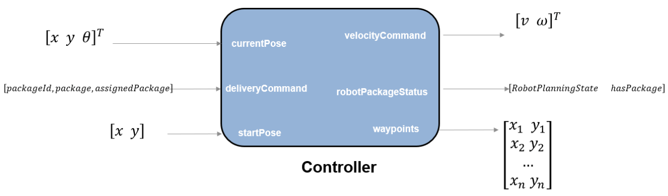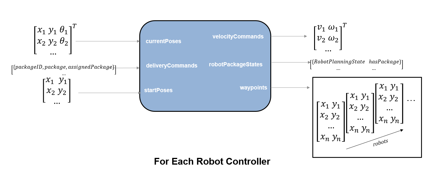 Контроллер берет команды доставки, который содержит информацию о пакете и планирует путь поставку его кто-то на складе с помощью mobileRobotPRM. Блок Pure Pursuit выбирает это путь и генерирует скоростные команды для посещения каждого waypoint. Кроме того, состояние робота и пакетов обновляется, когда робот достигает своей цели. Каждый робот также имеет свой собственный внутренний планировщик, который говорит им местоположение о разгрузке станций на основе информации о пакете и передает обратно их в станцию загрузки, когда они привозят пакет.