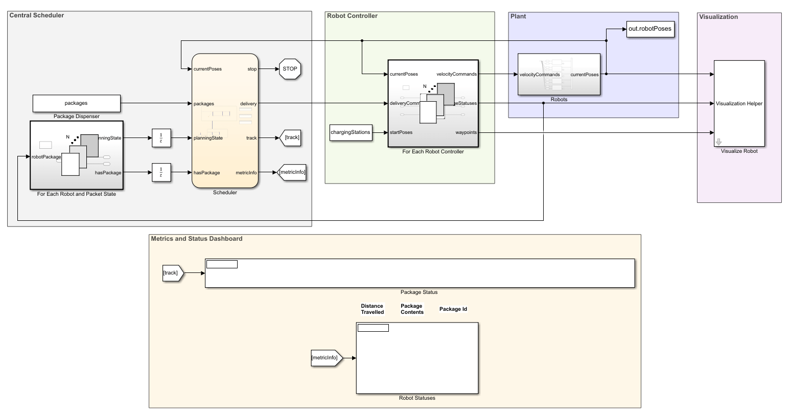 Этот сортирующий пакет сценарий может быть смоделирован в Simulink® с помощью диаграмм Stateflow и блоков алгоритма Robotics System Toolbox™. Центральный Планировщик отправляет команды в роботов, чтобы поднять пакеты со станции загрузки и поставить им определенной станции разгрузки. Диспетчер Робота планирует траекторию на основе местоположений станций загрузки и разгрузки и генерирует скоростные команды для робота. Эти команды питаются Объект, который содержит модель робота с дифференциальным приводом для выполнения скоростных команд и возврата положений основной истины робота. Положения возвращены к планировщику и контроллеру для отслеживания состояния робота. Этот рабочий процесс сделан для группы из 5 роботов, которые все запланированы, прослежены и смоделированы одновременно.