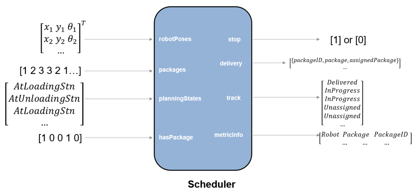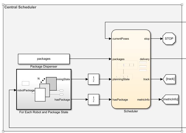 Центральный Планировщик использует диаграмму Stateflow, чтобы обработать выделение пакета к роботам от Фармацевта Пакета. Каждый робот может нести один пакет за один раз и проинструктирован, чтобы пойти от загрузки до разгружающейся станции на основе необходимого местоположения для каждого пакета. Планировщик также отслеживает состояние пакетов и роботов и обновляет Инструментальную панель Состояния. На основе положений робота планировщик также отправляет команды остановки в одного робота, когда это обнаруживает неизбежное столкновение. Это поведение может позволить роботам запускать локальное предотвращение препятствия при наличии.