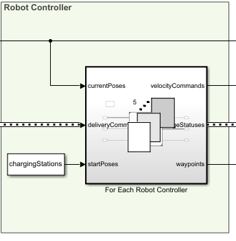Диспетчер Робота использует Для Каждой Подсистемы (Simulink), чтобы сгенерировать массив контроллеров робота для ваших 5 роботов.