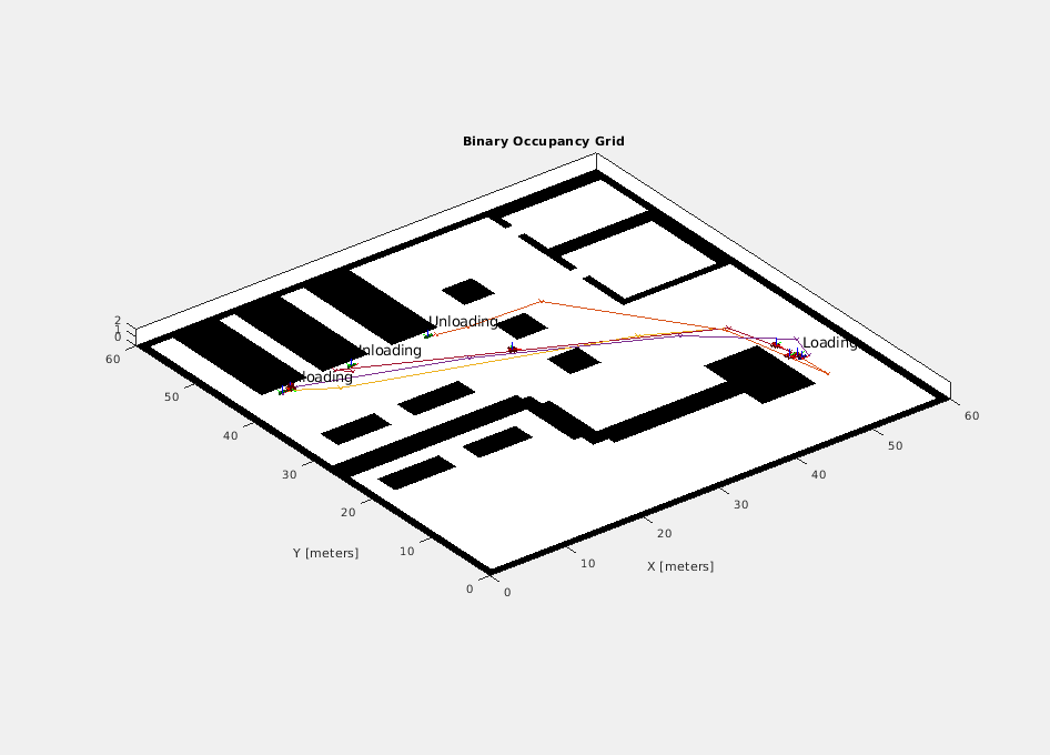 map = binaryOccupancyMap(logicalMap); if(any(checkOccupancy(map, [chargingStations; loadingStation; unloadingStations]))) error("At least one of the station locations is occupied in the map.") end