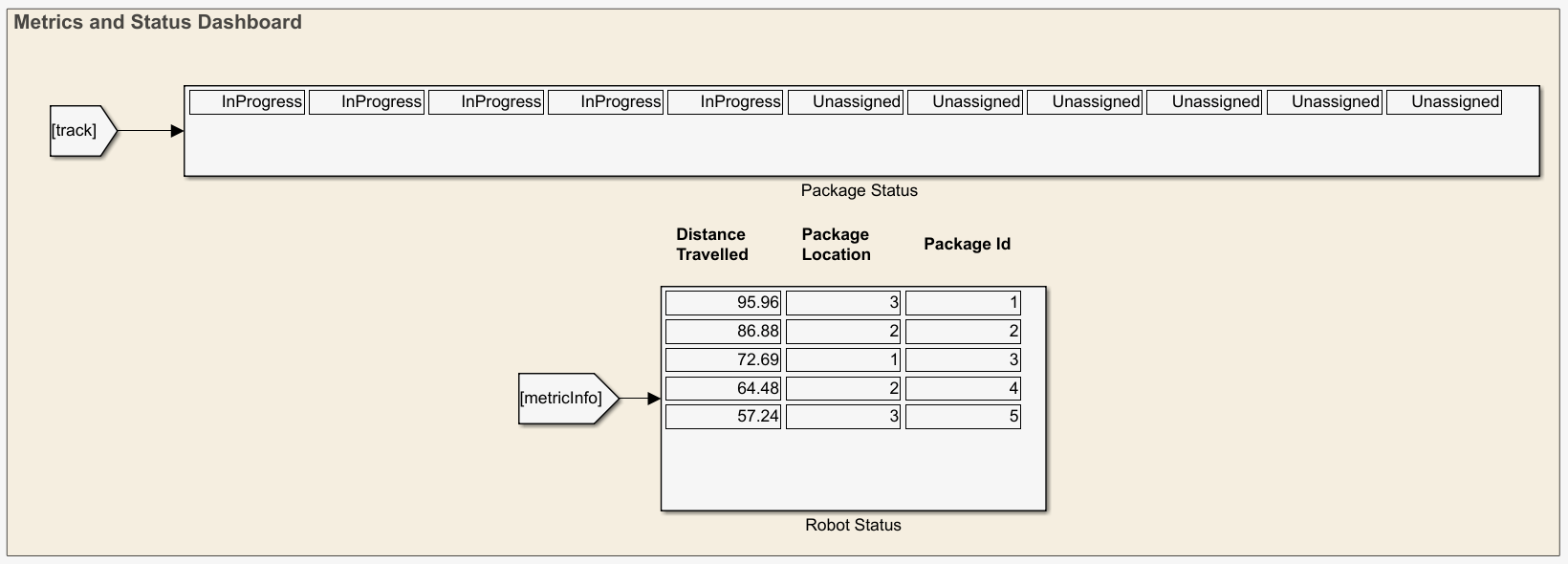 Для Каждой подсистемы состояния Робота и Пакета Для Каждой Подсистемы (Simulink), который обрабатывает массив шин для отслеживания робота и состояний пакета как RobotPackageStatus объект шины. Это дает возможность обновлять эту модель для различного количества роботов. Для получения дополнительной информации об обработке массивов шин с помощью Для - Каждая Подсистема, смотрите работу с Массивами Шин (Simulink).