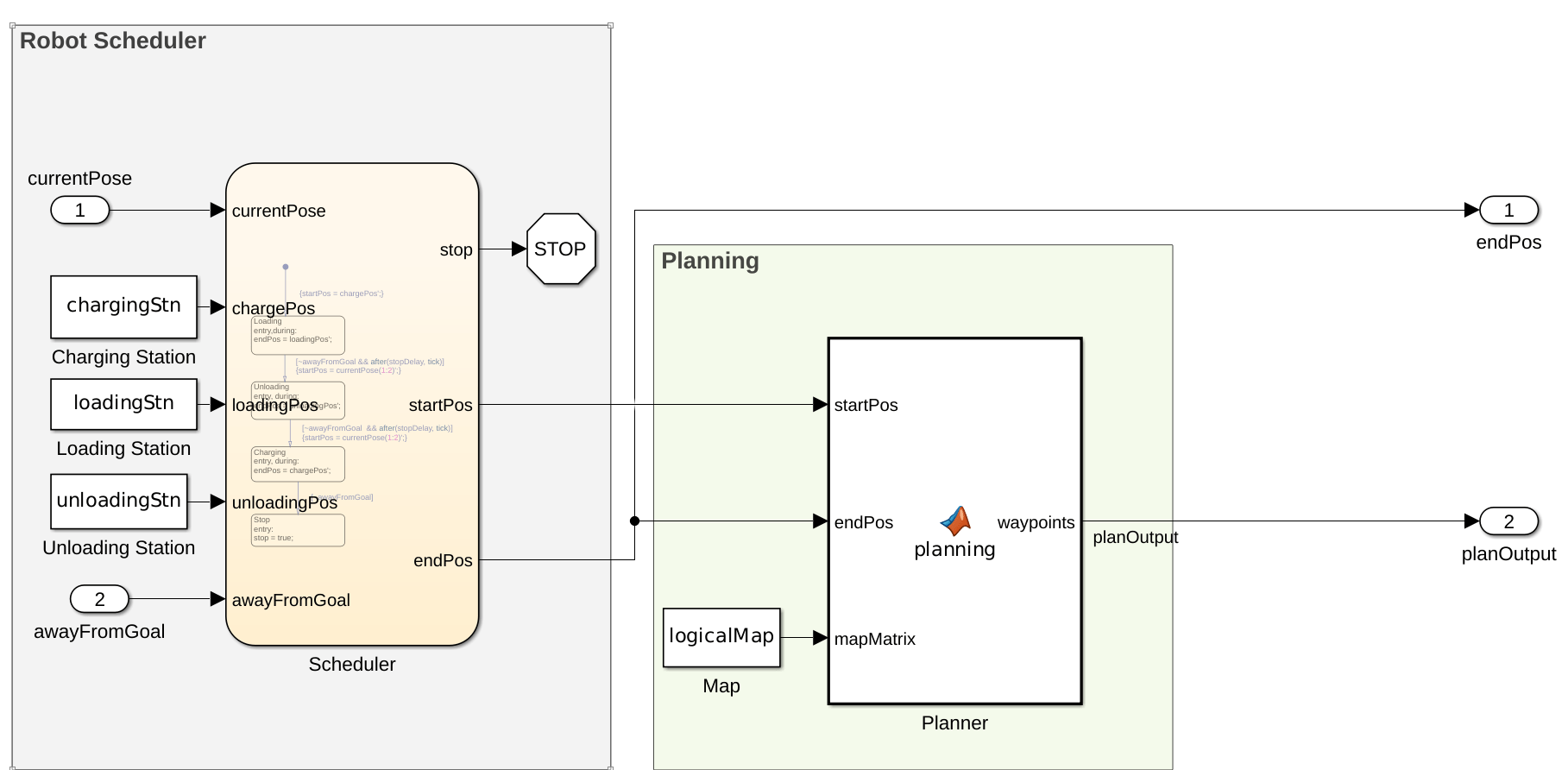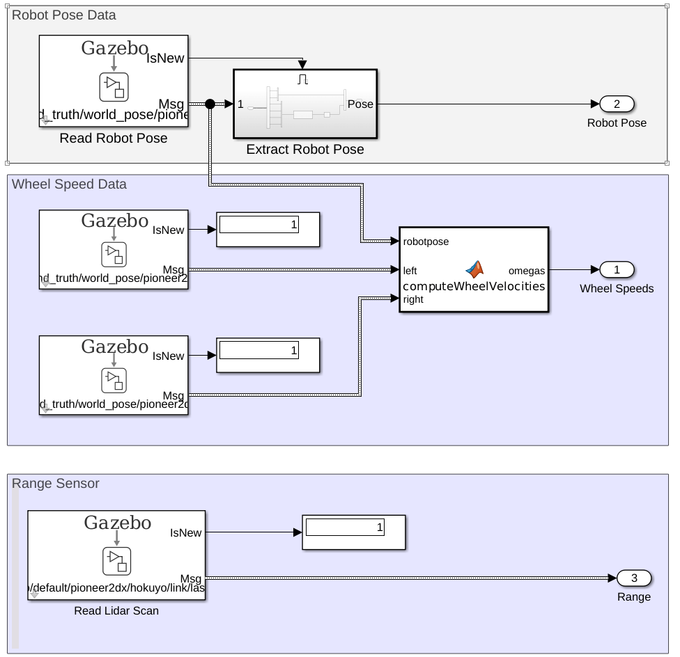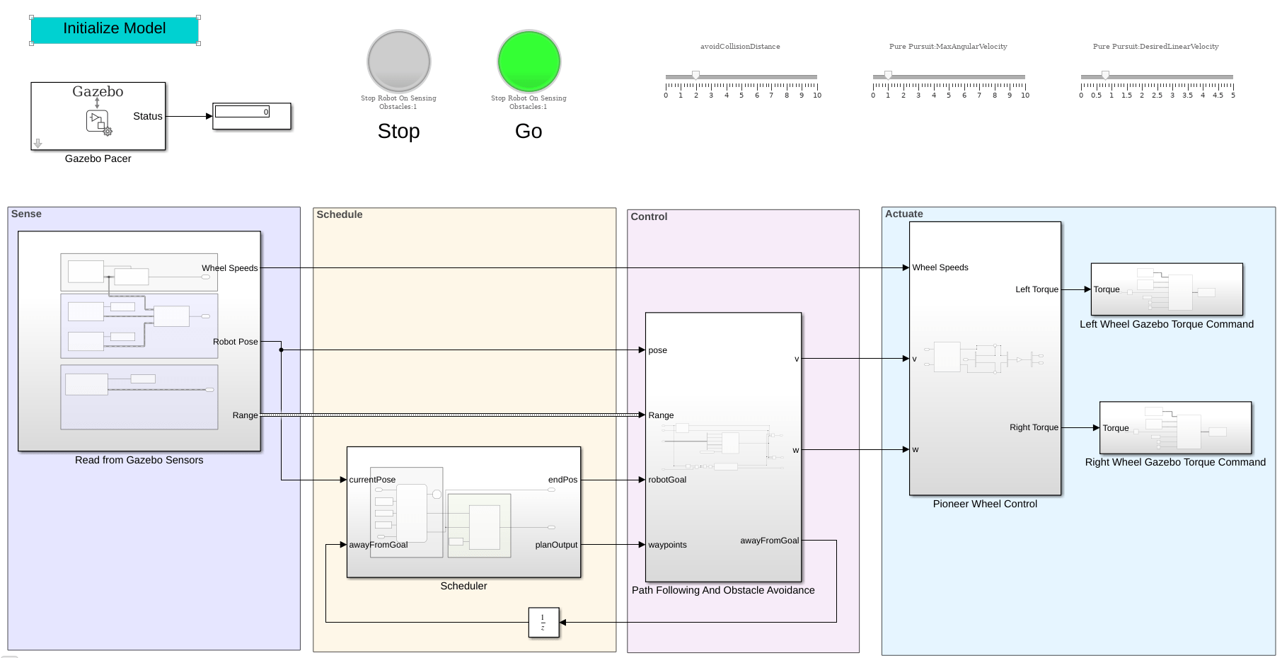 open_system('simulateWarehouseRobotInGazebo.slx')Модель может быть разделена на следующие элементы: