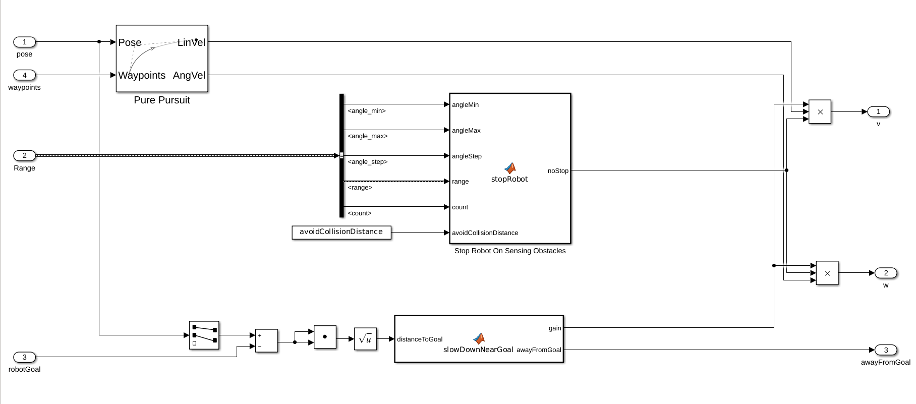 Контроллер генерирует команды управления для следующего waypoints использование блока Pure Pursuit. Если датчик области значений на роботе обнаруживает препятствие в avoidCollisionDistance порог, остановки робота. Кроме того, робот останавливается, когда добирается около достаточно до цели.