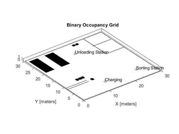 hold on; text(chargingStn(1), chargingStn(2), 1, 'Charging'); plotTransforms([chargingStn, 0], [1 0 0 0]) text(loadingStn(1), loadingStn(2), 1, 'Sorting Station'); plotTransforms([loadingStn, 0], [1 0 0 0]) text(unloadingStn(1), unloadingStn(2), 1, 'Unloading Station'); plotTransforms([unloadingStn, 0], [1 0 0 0]) hold off;