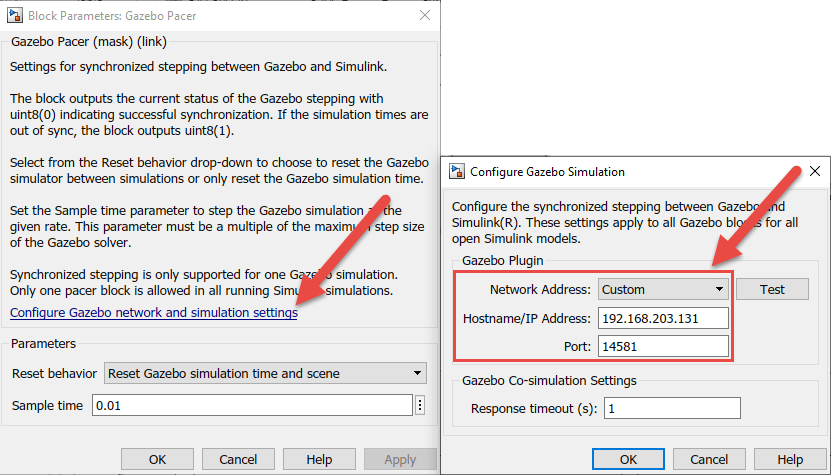 Чтобы симулировать сценарий, настройте связь с Gazebo.