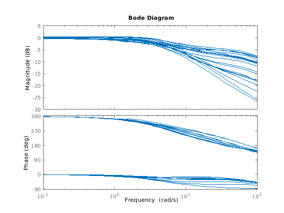 Обратите внимание на то, что результат G также неопределенная система, с зависимостью от обоих Delta и bw. Можно использовать bode сделать Диаграмму Боде 20 случайных выборок G's поведение по частотному диапазону [0.1 100] rad/s.
