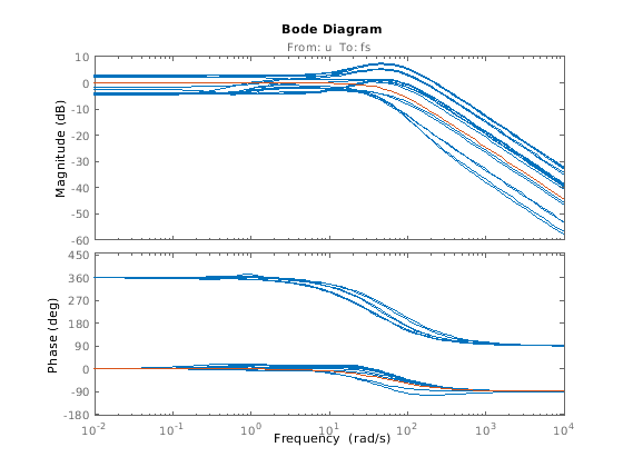 • Использование ucover создать uss модель, чья область значений возможных частотных характеристик включает все ответы в массив числовых моделей LTI. Получившаяся модель описывает область значений поведений как динамическая неопределенность (ultidyn).