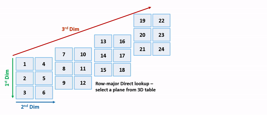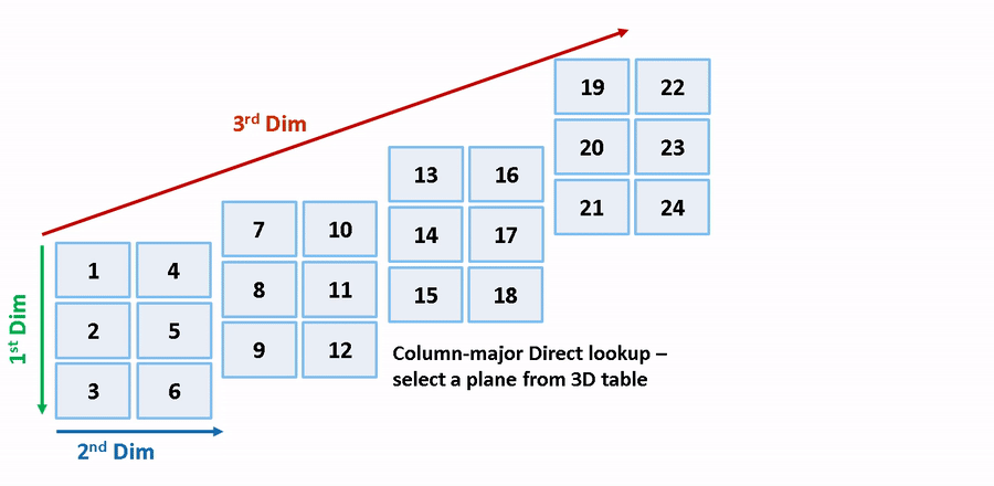 Упорядоченные по столбцам и упорядоченные по строкам алгоритмы отличаются семантически по выбору выходного вектора. Например, в 2D таблице, Simulink выбирает вектор-столбец, как выведено для упорядоченного по столбцам алгоритма и вектора-строки для упорядоченного по строкам алгоритма. В таблице с 3-D или более высокой размерностью Simulink выбирает выходной вектор из первой размерности таблицы для упорядоченного по столбцам алгоритма и от последней размерности таблицы для упорядоченного по строкам алгоритма. Элементы выбранного вектора непрерывны в табличной памяти устройства хранения данных. В этом примере последняя размерность является третьей размерностью 3-D таблицы. Из-за семантического изменения, упорядоченные по столбцам и упорядоченные по строкам прямые алгоритмы интерполяционной таблицы выводят различный размер вектора и числовые значения.