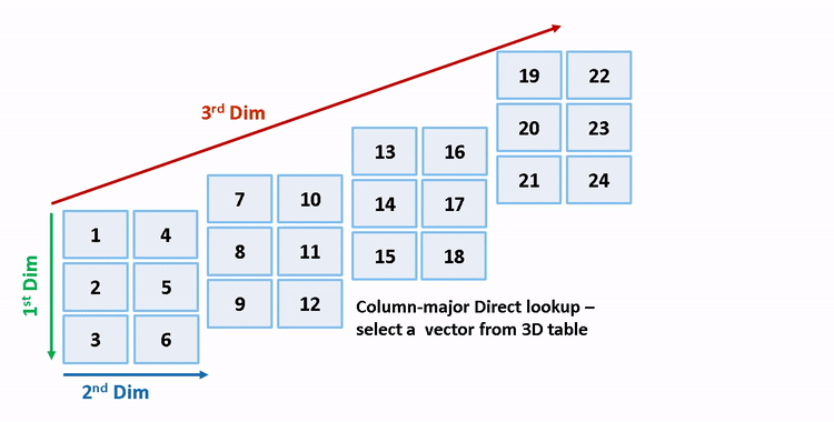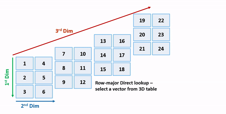 1. Блок rtwdemo_col_dlut3d_selvector/Direct Lookup Table (n-D) имеет 3-D табличные данные, которые T3d = изменяют ([1:24], 3,2,4) и два входных порта со значением 0 и 1 (оба - индексы на основе 0). Выбранный выходной вектор является T3d (: 1,2) (индекс на основе 1) для упорядоченного по столбцам алгоритма. Чтобы сохранить семантику для упорядоченного по строкам алгоритма на той же модели, то есть, выбирают тот же вектор с теми же входными параметрами порта индекса, переставляют таблицу, как T3d_p = переставляют (T3d, [2,3,1]). Для упорядоченного по строкам алгоритма выбранный вектор является T3d_p (1,2, :).