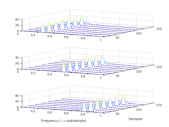 z = abs(re + 1j*im); for kj = 1:nchan subplot(nchan,1,kj) waterfall(f/pi,t,squeeze(z(:,kj,:))') view(30,45) end xlabel('Frequency (\times\pi rad/sample)') ylabel('Samples')