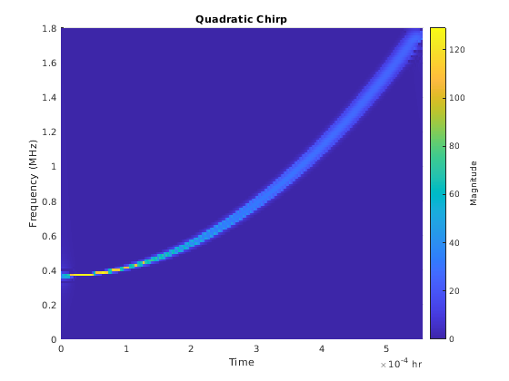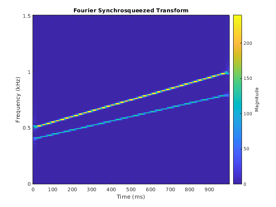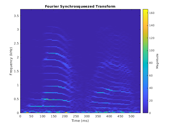 Synchrosqueezed преобразование Фурье основано на кратковременном преобразовании Фурье, реализованном в spectrogram функция. Для определенных видов неустановившихся сигналов synchrosqueezed преобразовывают, напоминает переприсвоенную спектрограмму, потому что она генерирует более резкие оценки частоты времени, чем обычное преобразование. fsst функция определяет кратковременное преобразование Фурье функции, f, с помощью спектрального окна, g и вычисления