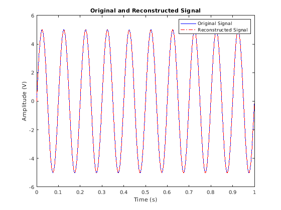 plot(t,x,'b') hold on plot(T,X,'-.r') xlabel('Time (s)') ylabel('Amplitude (V)') title('Original and Reconstructed Signal') legend('Original Signal','Reconstructed Signal') hold off