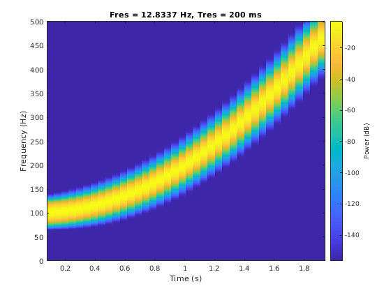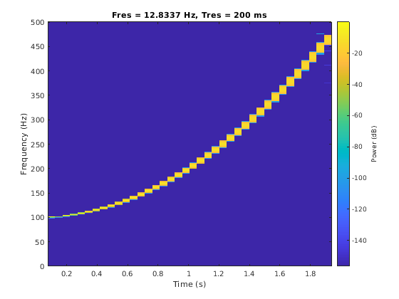 pspectrum(S,'spectrogram', ... 'TimeResolution',0.5,'OverlapPercent',0,'Leakage',0.85)